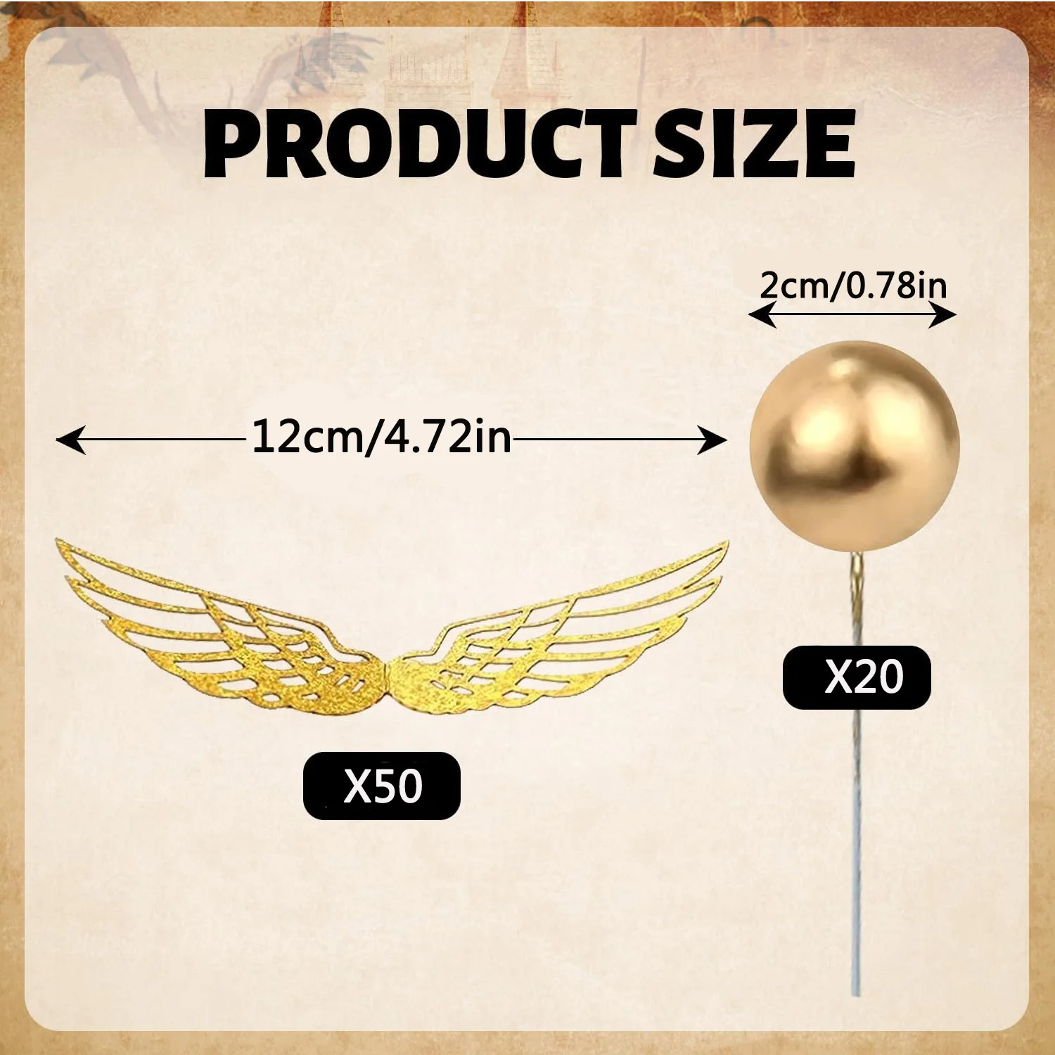 • 【Tamanho e material】Cada asa tem aproximadamente 4,72 polegadas, a bola tem aproximadamente 0,78 polegadas, tamanho adequado para decorações de bolo mágico, o que tornará toda a sua festa mais interessante e atraente.A decoração das asas douradas é feita de papel de qualidade, durável e confiável, proporcionando uma boa experiência de uso.