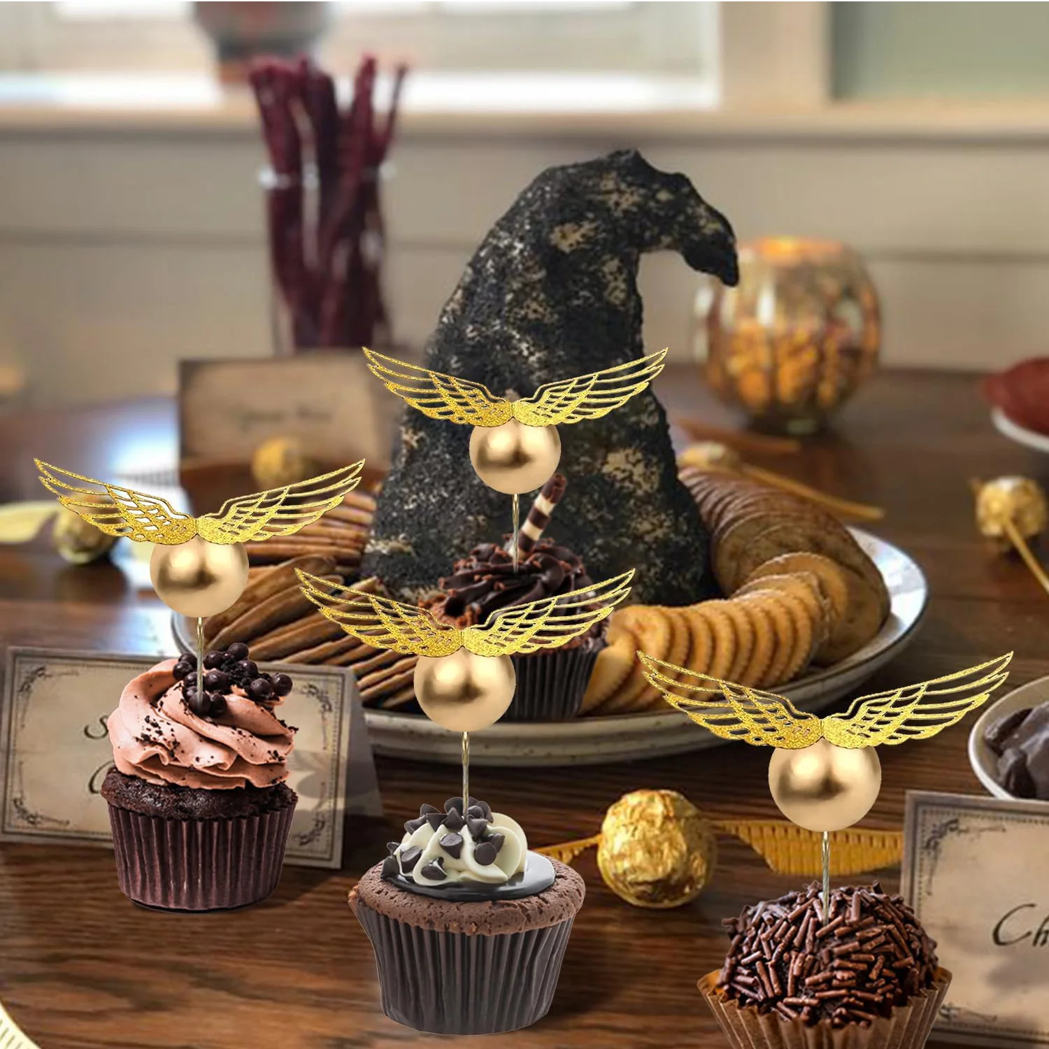 • 【Design exclusivo】Nossas decorações de aniversário do mago são projetadas com asas e bolas douradas, delicadas, adoráveis, mas não monótonas, elas podem adicionar uma sensação de requinte ao seu bolos temáticos de mago mágico, tornando o nível decorativo rico.