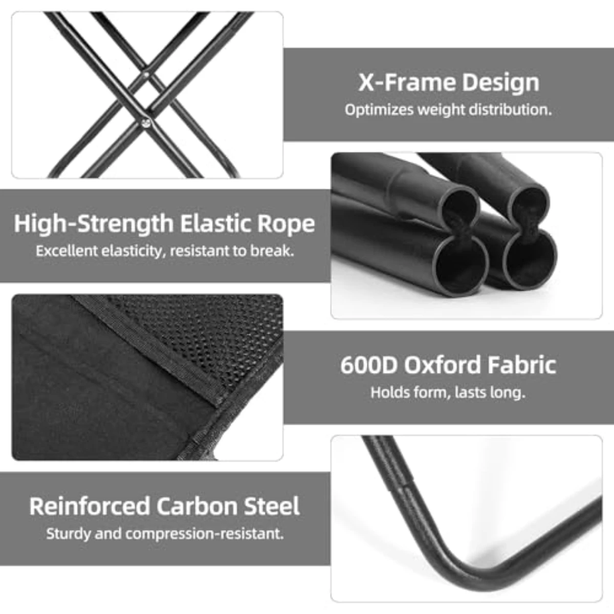 Fabricada com uma estrutura robusta em liga de ferro, esta cadeira dobrável portátil garante durabilidade, mantendo um design leve para fácil transporte.